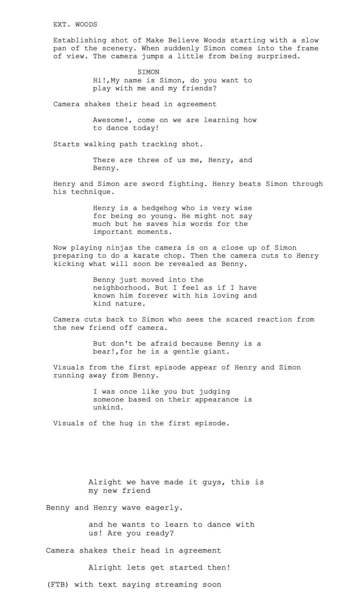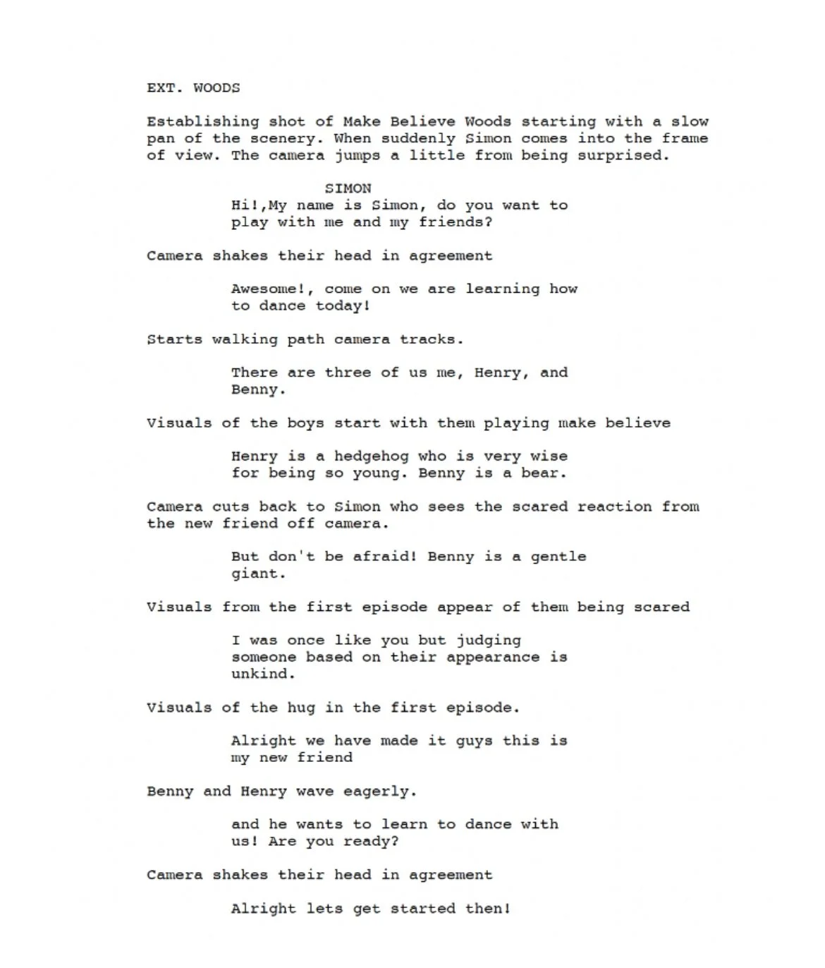 When creating the script I went for the camera being a potential friend that Simon wanted to join in the fun that day. Inspiration for this type of setup came from the shows, Blues Clues and Mister Rogers Neighborhood.