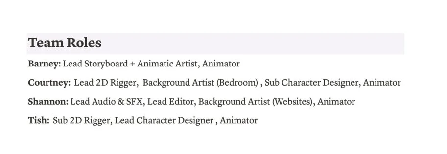 Also that presentation gave way to some confusion with everyone's roles because Courtney thought that the bed fell into background art instead of prop. Which she thought was one of her roles and not mine. As a team we discussed what category certain objects fell under my control. We also went from a Gantt chart to using Notion as a calendar. I was not the only one confused so we re-identified our roles on that site to differ from any further miscommunication.
