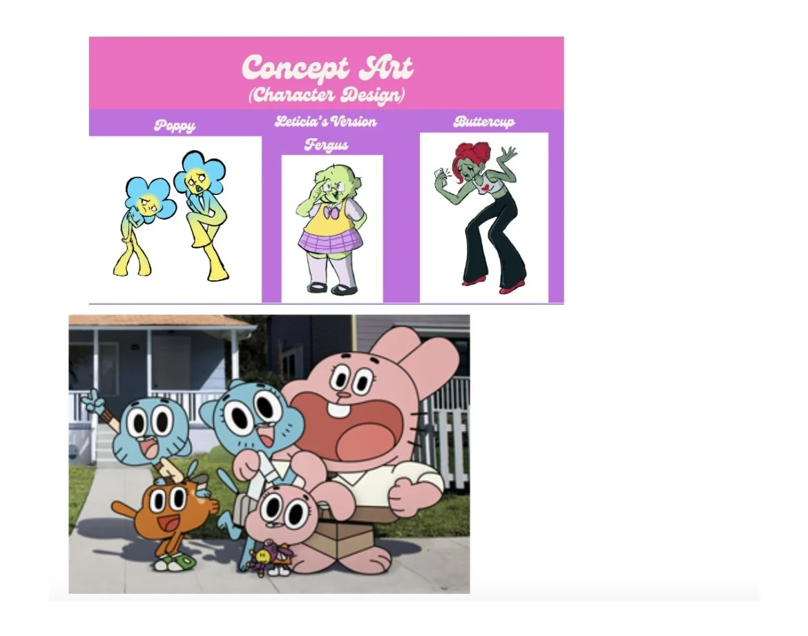 Then the question of what the characters would look like led us to creating concept art and explaining our now collective idea for our mock client Rachel through a canva presentation. After seeing how different our character designs were we decided to go to pick each one of our characters in The Amazing World of Gumball fashion but they would be under the style of the particular artist. Which would most likely be Tish again because her style resembled Cartoon Network the most.