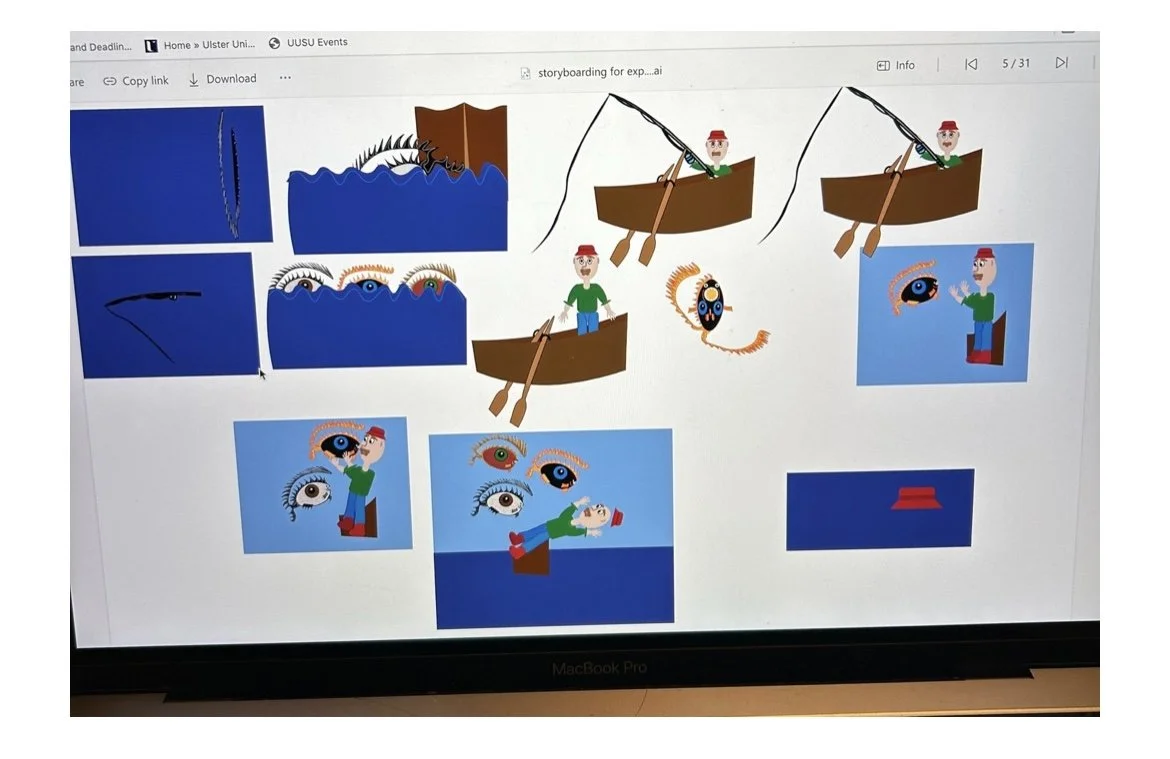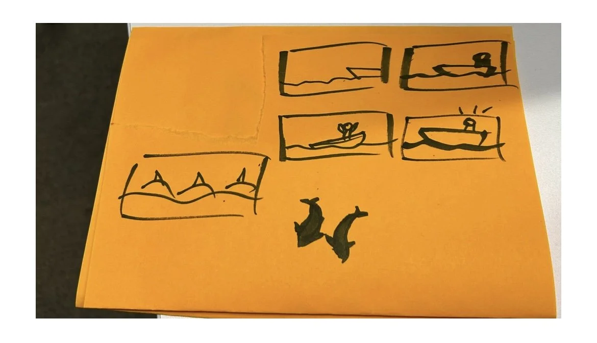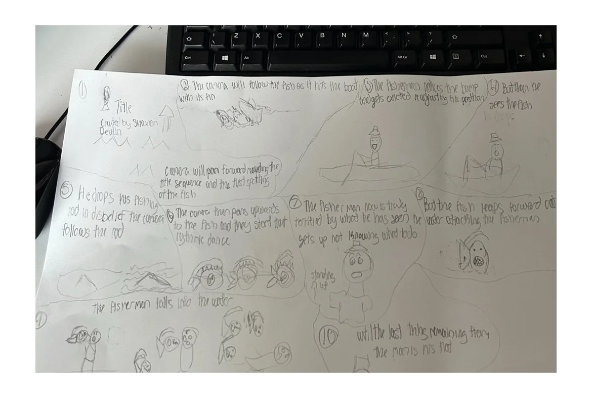 After the pitch I was given notes on the design simplicity of the fish and how to make the fisherman less unsettling since he is not the enemy in this story. Only after the idea was approved did I go on and sketch a full storyboard first physically on paper and then on Adobe Illustrator.