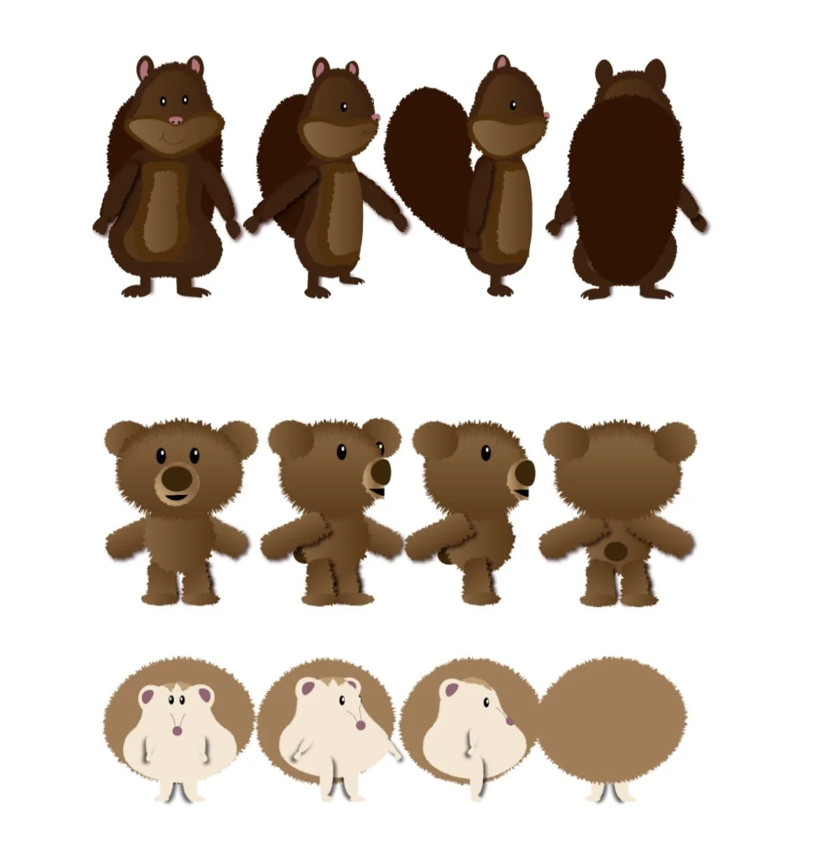 As you can see after careful deliberation I landed on a story of friendship between Simon, Henry, and Benny. With this assignment being a pitch bible I spent a long time on the designs of each character. After presenting my progress Sarah gave the suggestion to give the characters fur to make them fit better with the environment and the animal they are supposed to be. I did not know how to do such a thing in Adobe Illustrator so I looked up tutorials on adding fur.