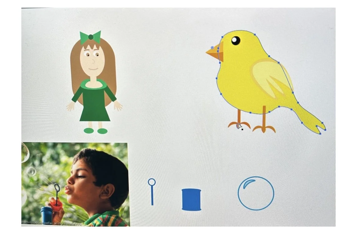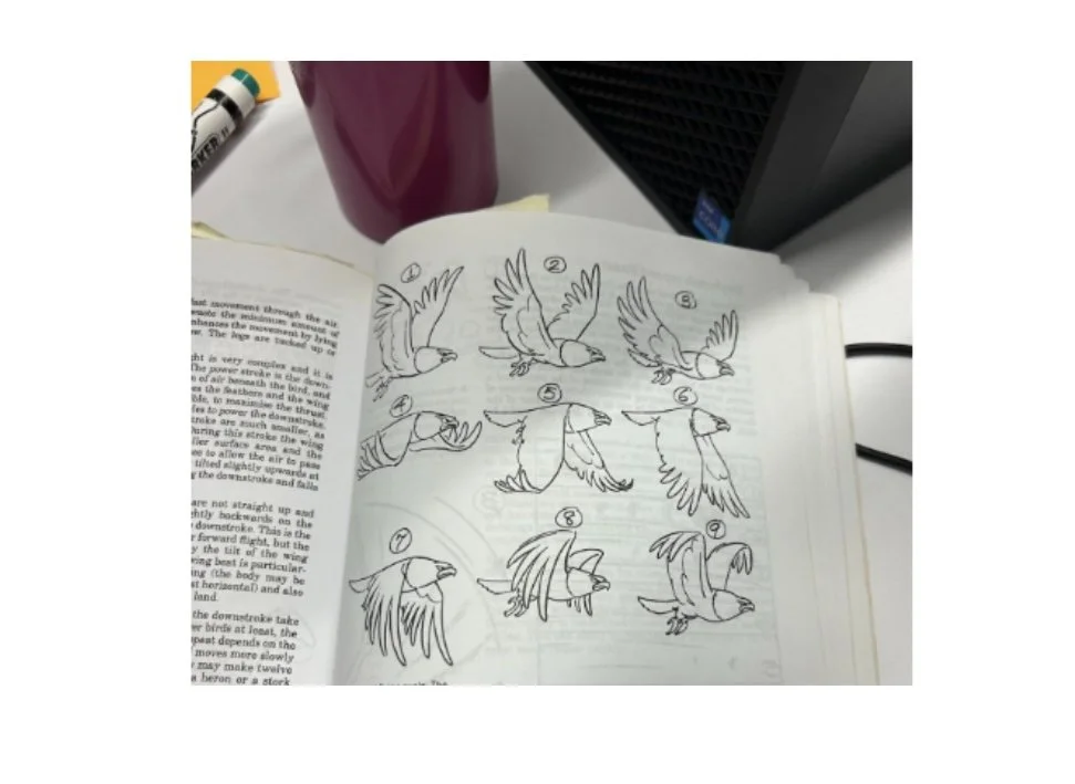 The bubbles proved hard to animate realistically but with classic tweening and going at a slow pace the outcome improved greatly. By the time I had finished the first three scenes and saw that the time was already at a total of 6 seconds and the rubric said it should be approximately 10-15 seconds. I knew I had to cut down the story because quality over quantity. The girl being at the left side of the screen left me feeling uneasy with how much negative space there now was even with all of the bubbles. So now the bird would fly in from the right and pop all the rest of bubbles in spit of the girl. When doing the key framing for the bird it looked more like a Roomba than a bird flying around. Again I had to draw the bird from a new perspective. The lecturer showed me different keyframes of an eagle flying from a book and that is greatly reflected in the final design of the bird.